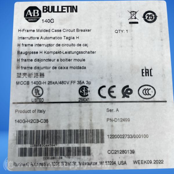 Allen Bradley 140G-H2C3-C35 Series A Molded Case Circuit Breaker, H frame, 25 kA at 480V, T/M Fixed Thermal / Fixed Magnetic TMF, Rated Current 35 A, 3 poles