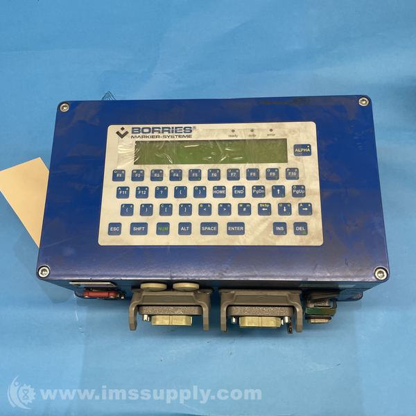 Industrial marking control unit from BORRIES Marking Systems, part number 100007787. The unit features a blue enclosure with a keypad interface and multiple connectors.