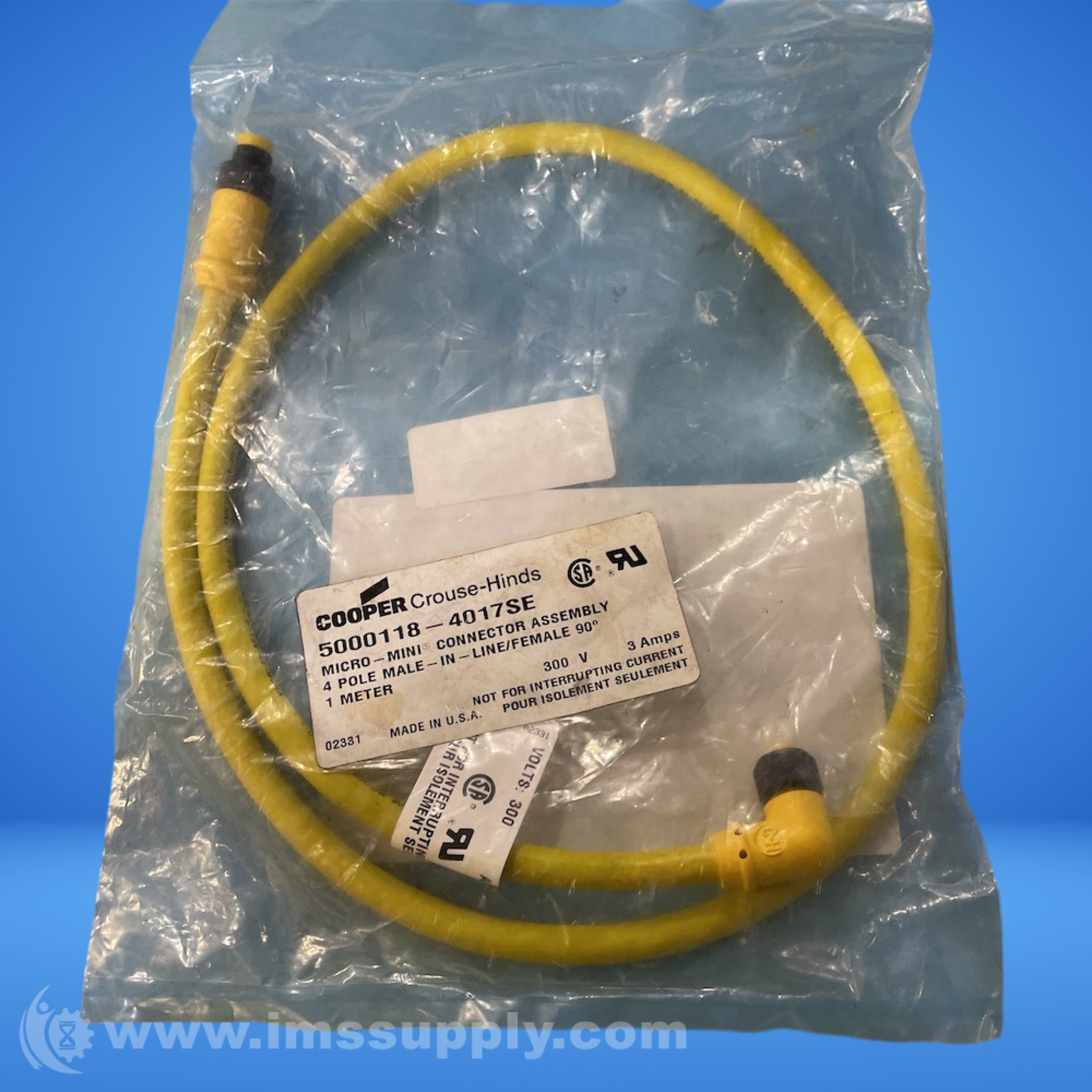 Micro-mini connector assembly with 4-pole male in-line/female 90-degree configuration, rated for 300V and 3 amps, 1 meter length.