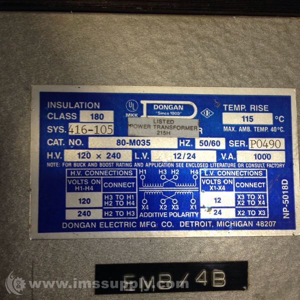 DONGAN 80-M035 SINGLE PHASE GENERAL PURPOSE TRANSFORMER