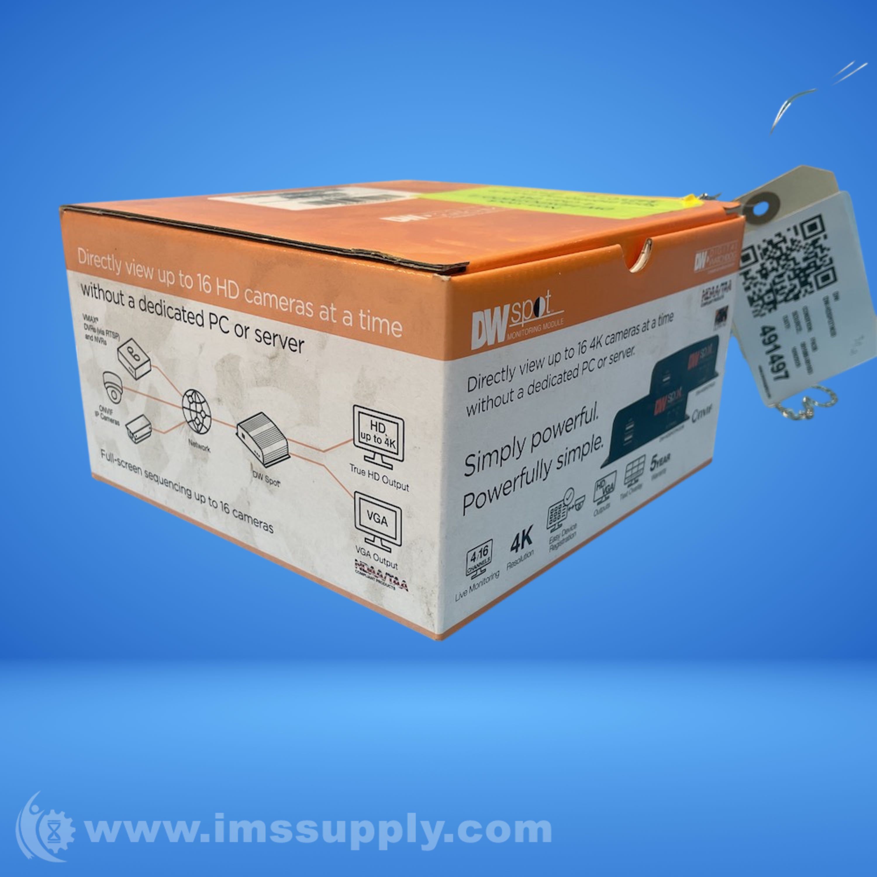 4-channel DW Spot monitoring module for ONVIF cameras, VMAX AHD Core DVRs, and VMAX IP Plus NVRs. Supports up to 4 HD cameras at 1920x1080 resolution. Includes HD and VGA outputs, USB mouse, and remote configuration via web browser.