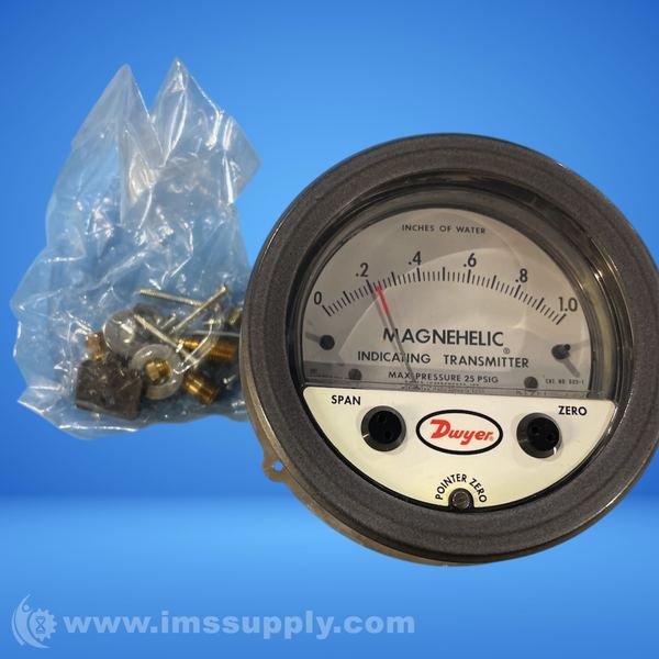 Differential pressure indicating transmitter with 4-inch dial face, measuring 0-1.0 inches WC, maximum pressure 25 psi, ±2% accuracy, and 4-20 mA output.