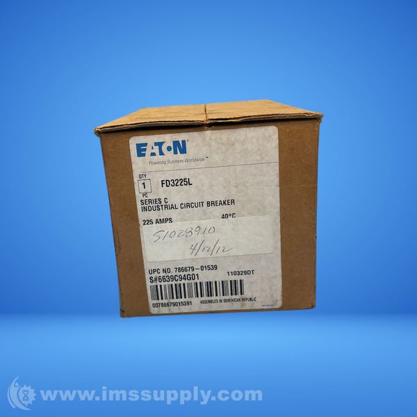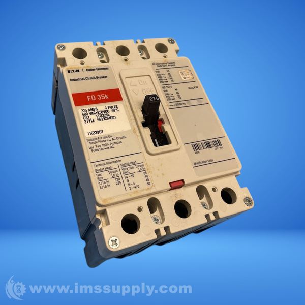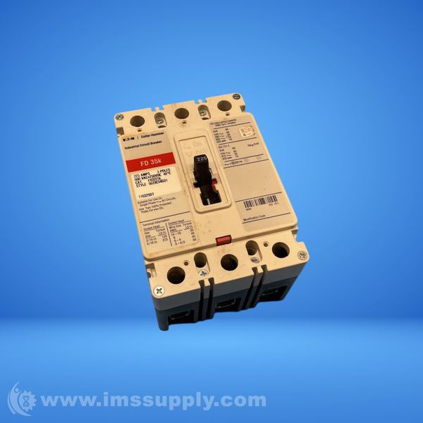 Eaton FD3225L is a 225 Amp, 3-Pole molded case circuit breaker with thermal-magnetic trip, 600VAC max, 35kAIC at 480VAC.