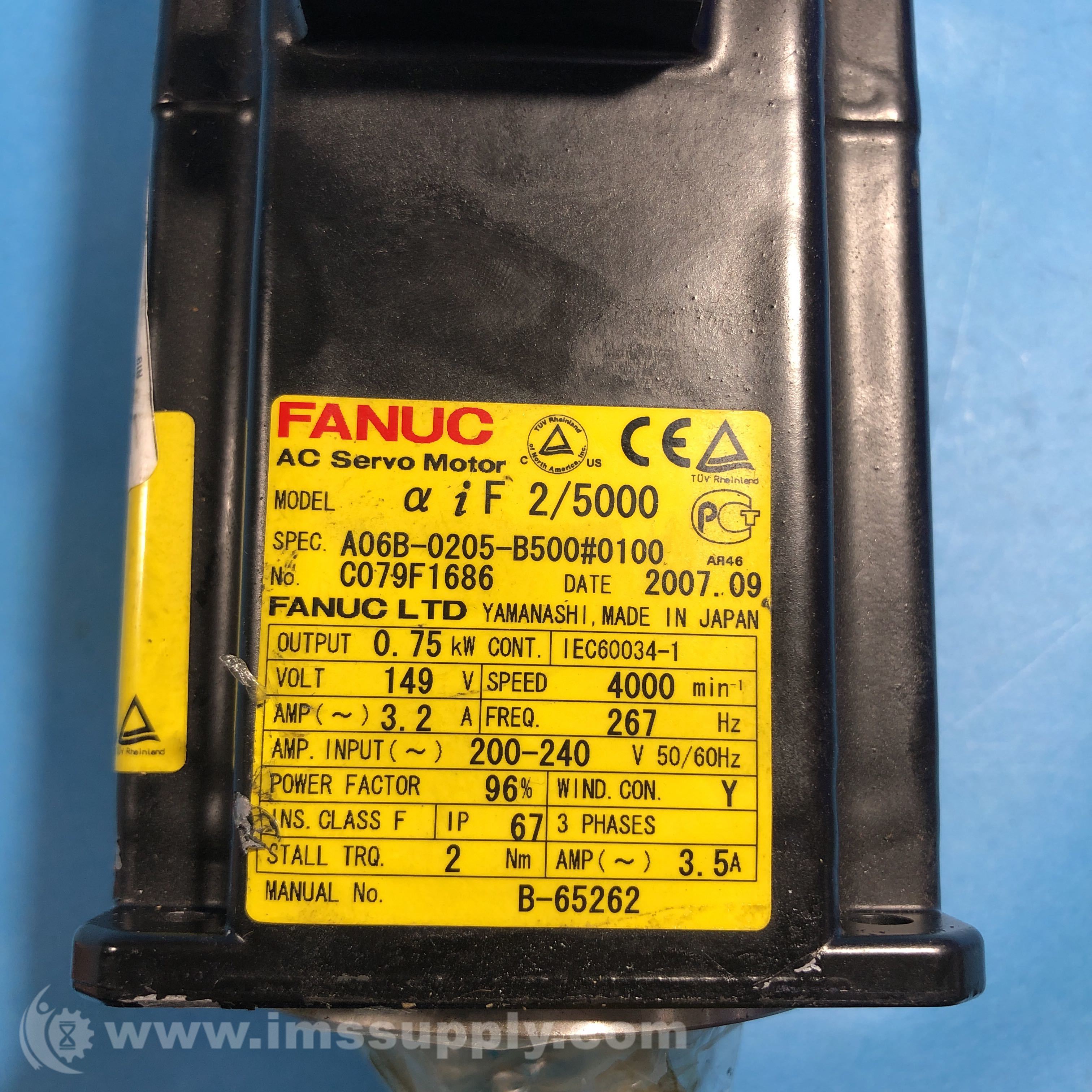 Fanuc A06B-0205-B500#0100 AC Servo Motor, 3-Phase, 4000RPM, 149V, 3.2A