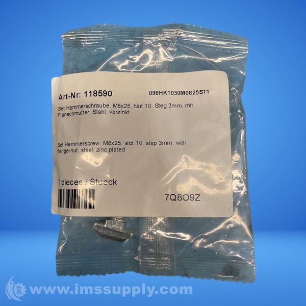 M8x25 hammer screw with flange nut, zinc plated steel, slot size 10. For use with 45mm and 90mm T-slotted rails.