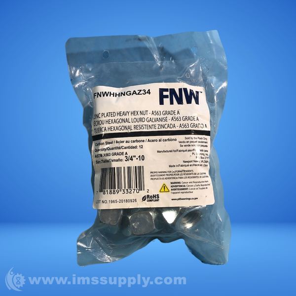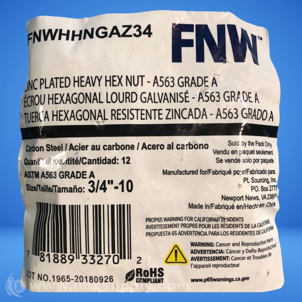FNW FNWHHNGAZ34 BAG OF 12 HEAVY HEX NUTS, ZINC PLATED, 3/4"-10