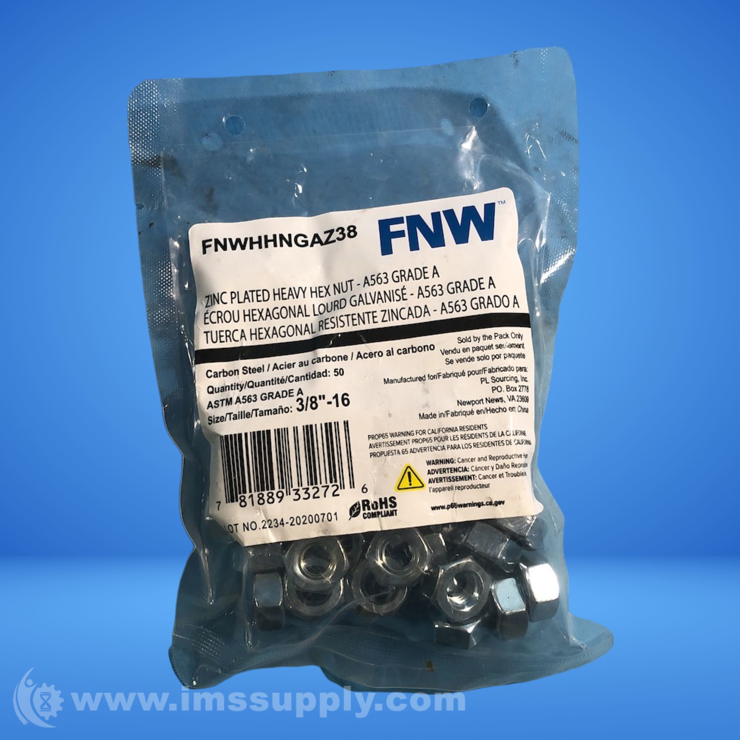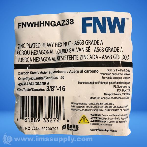 FNW FNWHHNGAZ38 BAG OF 50 HEX NUTS, 3/8" -16"