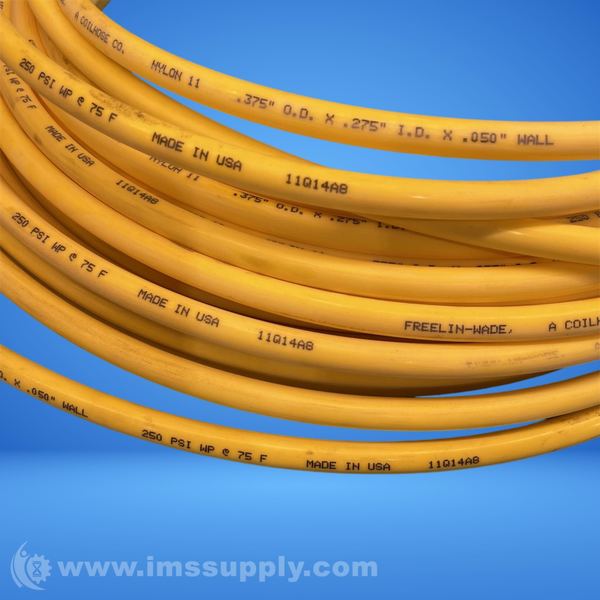 Nylon tubing manufactured by Freelin Wade with part number 11Q14A8, specified dimensions and pressure rating.