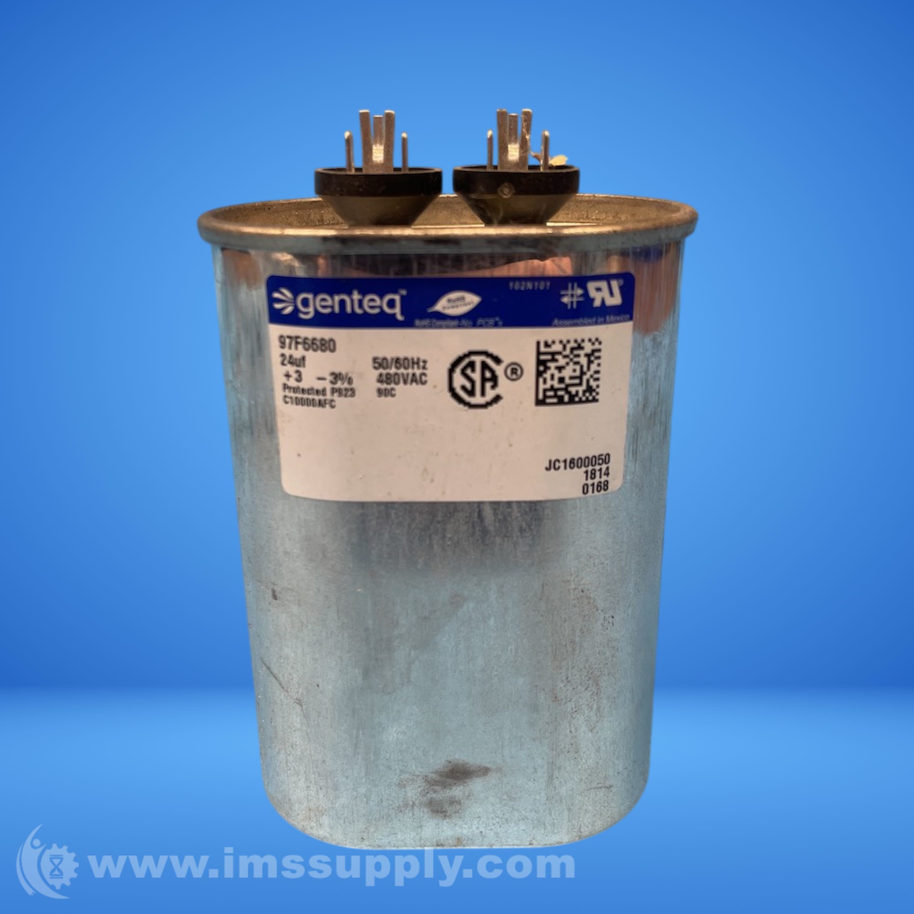 Motor run capacitor with 24uF capacitance and 480VAC voltage rating