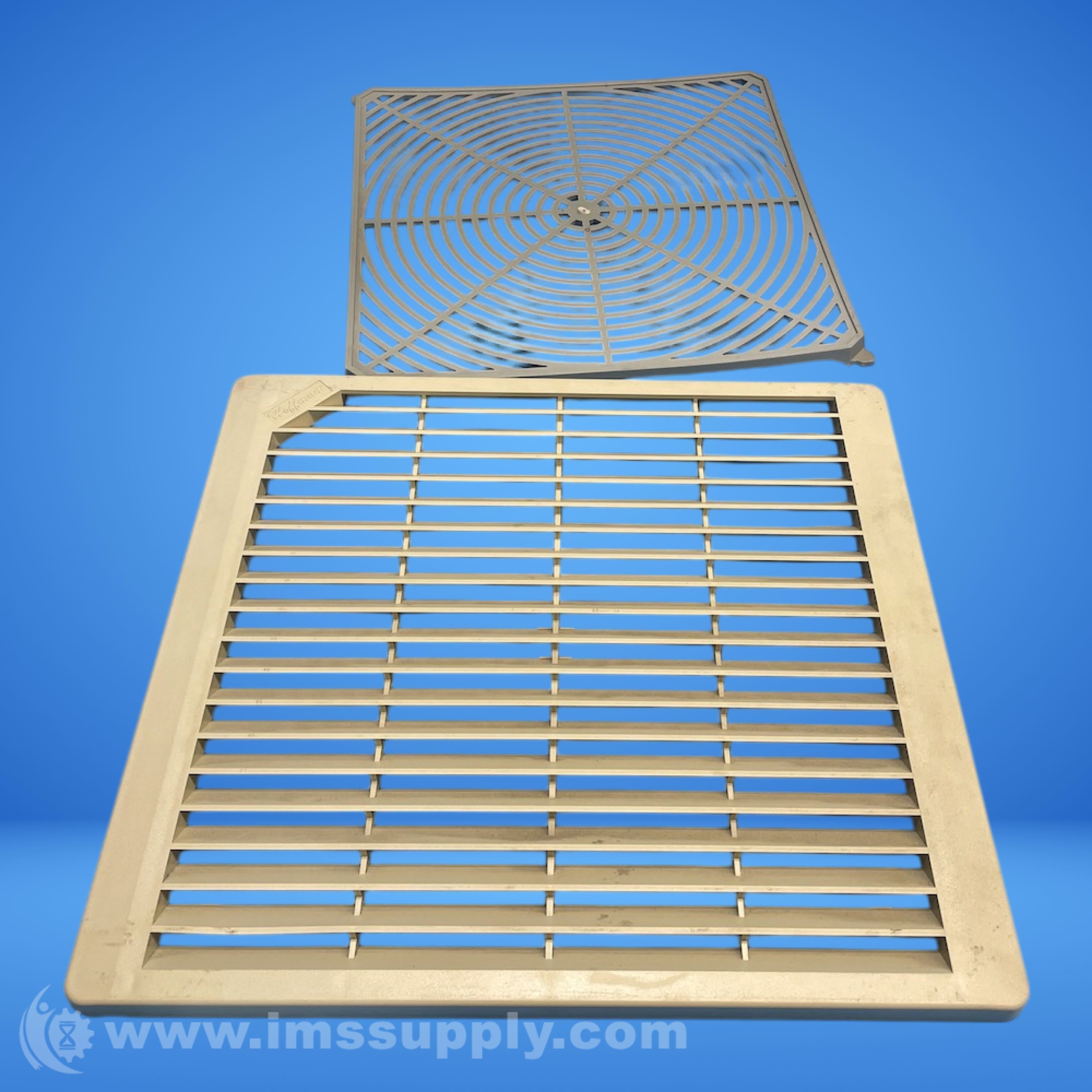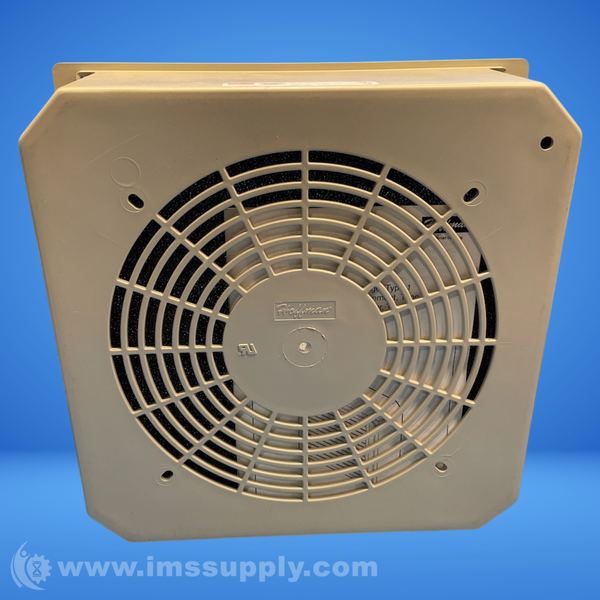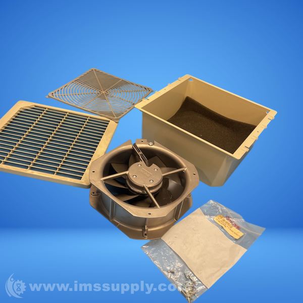 Square axial fan kit for equipment cooling in electrical enclosures, 115V AC, 10 inch size, composite housing, includes air filter, finger guard, and grille.