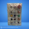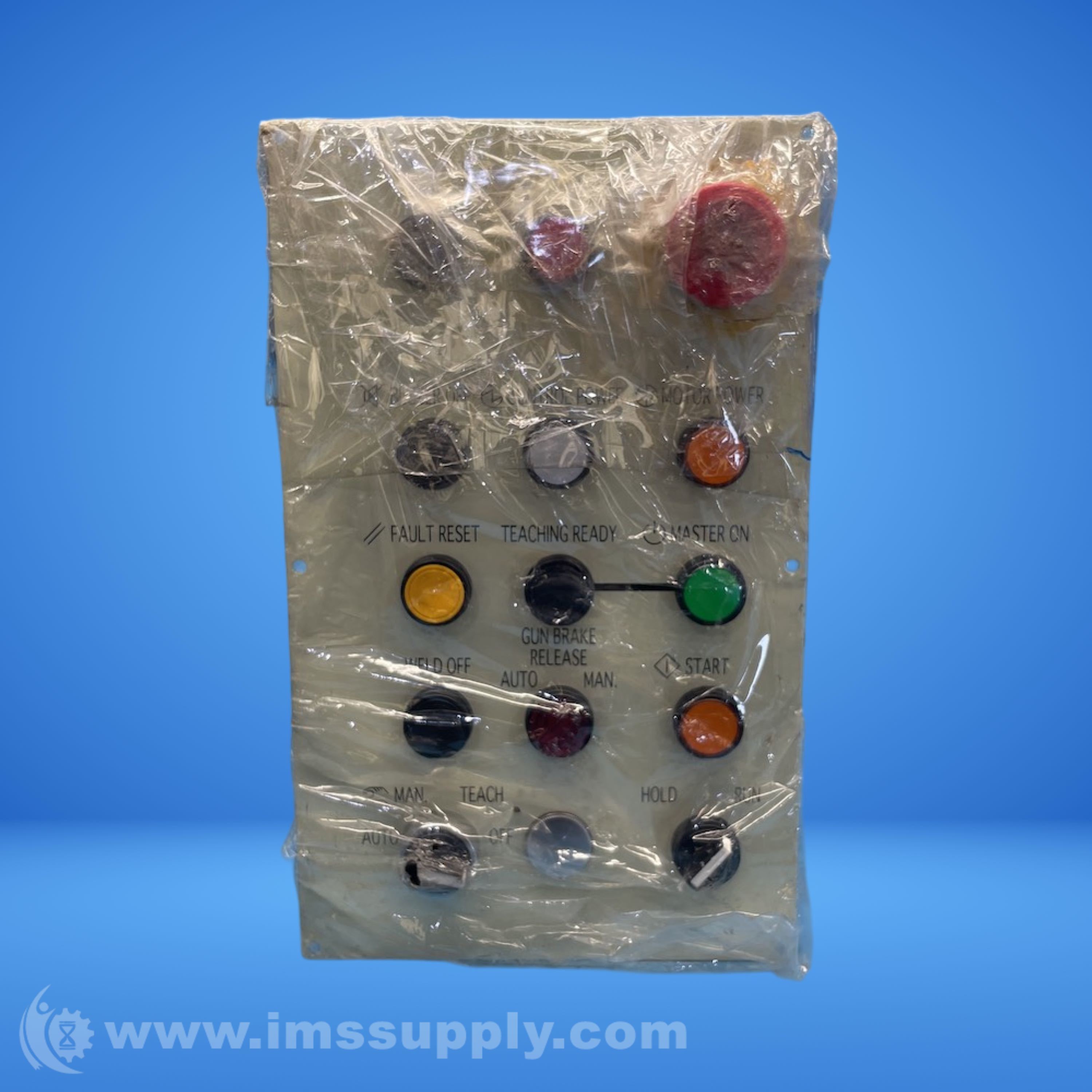 Industrial control panel for robotic systems, featuring multiple buttons and switches for operational control.