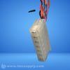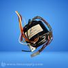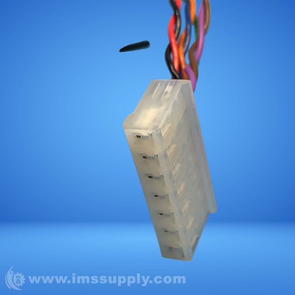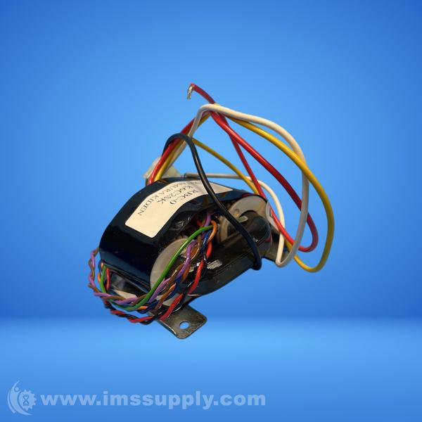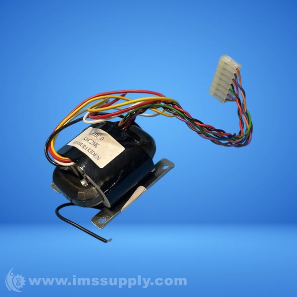 Stepper motor with multiple wires and a connector, labeled with part number and manufacturer