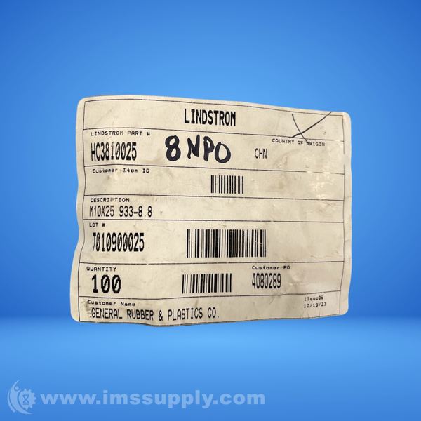 LINDSTROM HC3810025 M10 HEX HEAD CAP SCREW BAG OF 100