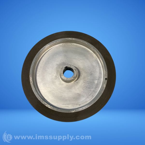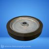 A rubber-coated wheel with a metal hub.