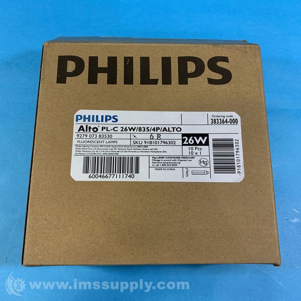 Phillips PL-C 26W/835/4P/ALTO Box of 10 Plug-In CFL Bulbs, PL-C, 4-Pin (G24Q-3), Lumens 1800 lm, Dimmable Yes, Watts 26W, Bulb: PL-C (Quad Tube), Base: 4-Pin (G24q-3), Lumens: 1800, CRI: 82, Color Temperature: 3500K, Rated Average Life: 12,000 Hrs
