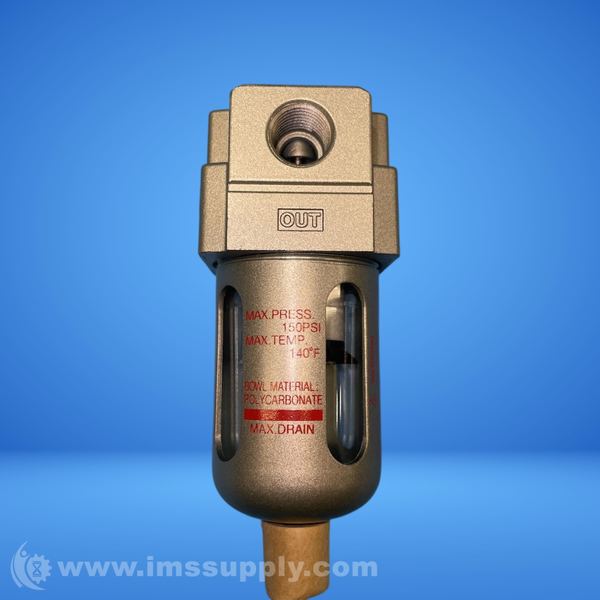 SMC modular air filter with 1/4 inch port size, 500 Lpm flow rate, 5 micron filter rating, 1 MPa pressure range, and polycarbonate bowl material.