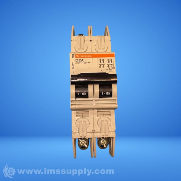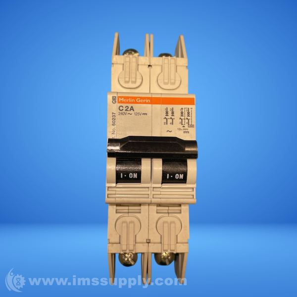 A miniature circuit breaker designed for electrical protection, rated for 2 A at 240 V or 125 V, with a C curve characteristic and 2 poles.