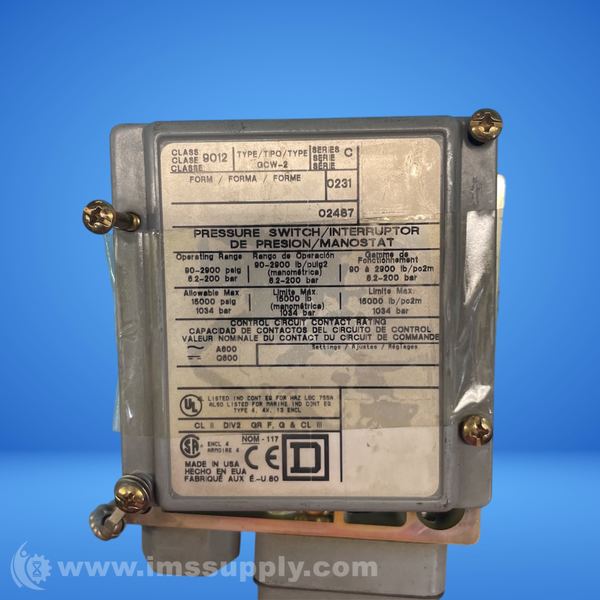 Square D 9012GCW2 Series C Pressure Switch, 90-2900 psi, 1/4 NPTF port, SPDT, UL CSA, 9012G Series