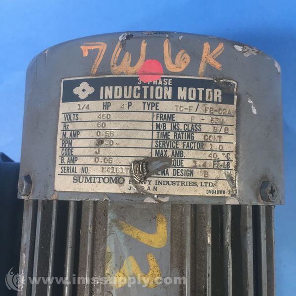 Sumitomo CNHM02-4085YA-B-25 3-Phase Induction Motor, Frame F-63M, Volts 460, Hz 60, 1/4 HP, 4 Pole