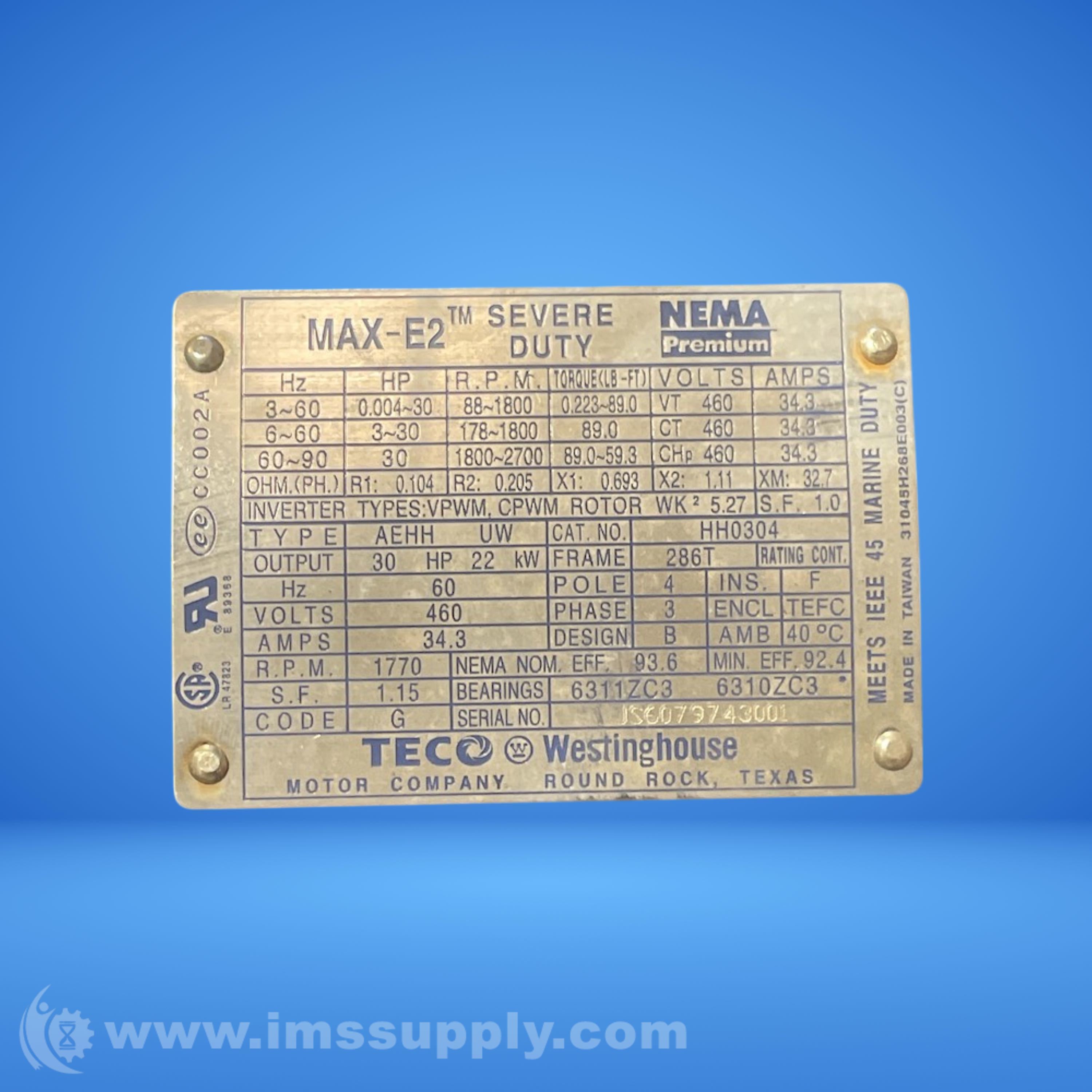 TECO WESTINGHOUSE HH0304 30 HP MOTOR