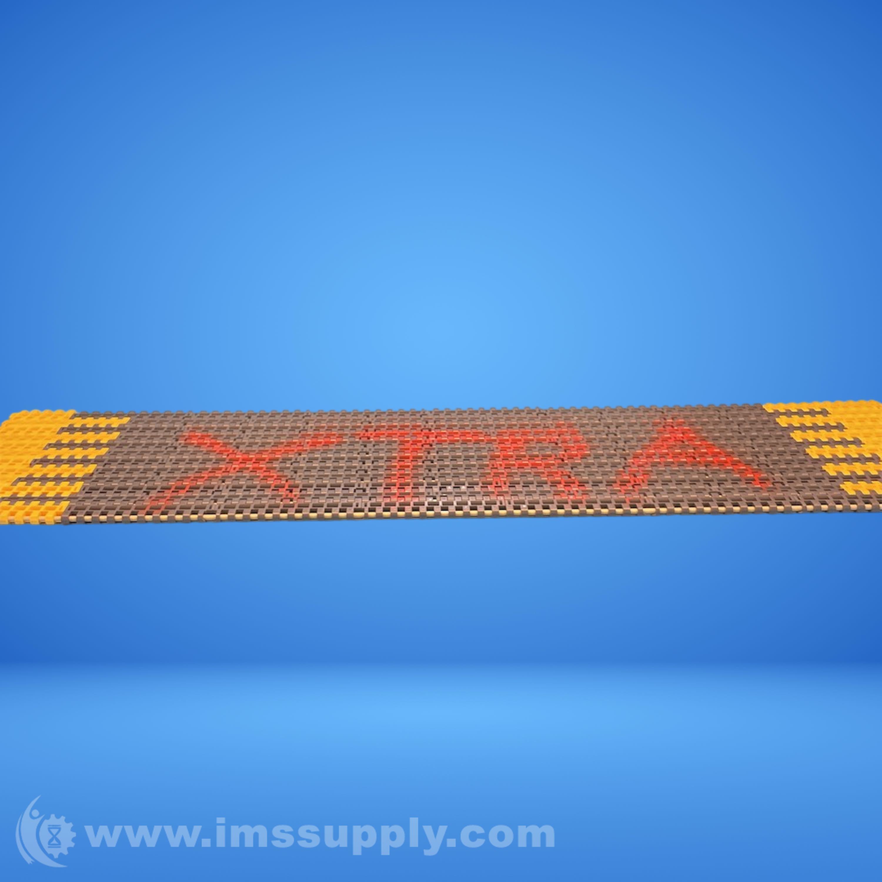 Flexible conveyor belt with patterned design and red markings, possibly used for material handling or processing applications