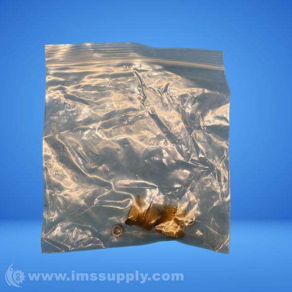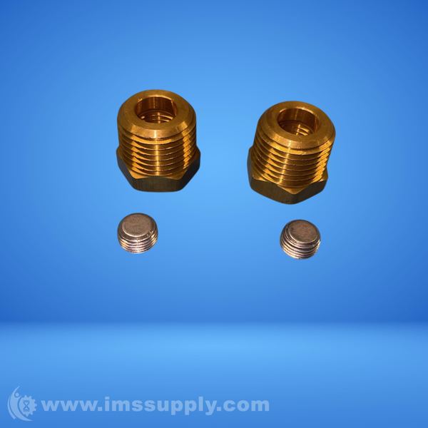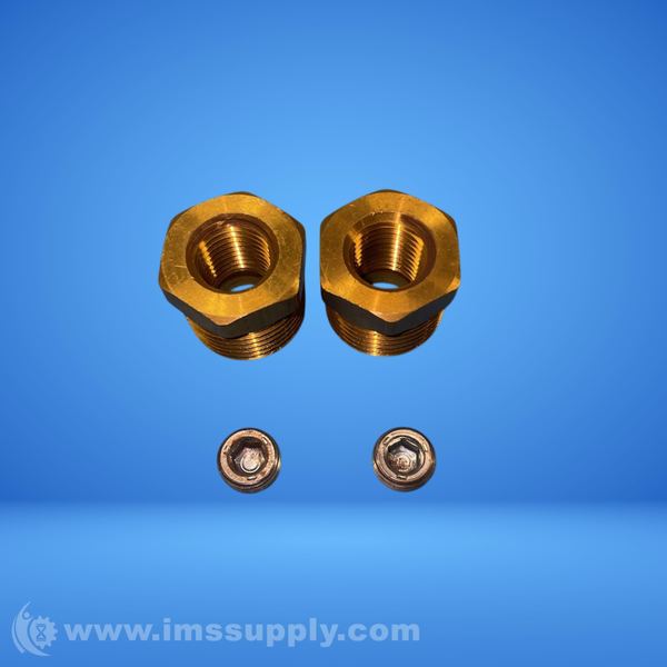 Brass adapter fittings with threaded connections and accompanying washers or nuts.