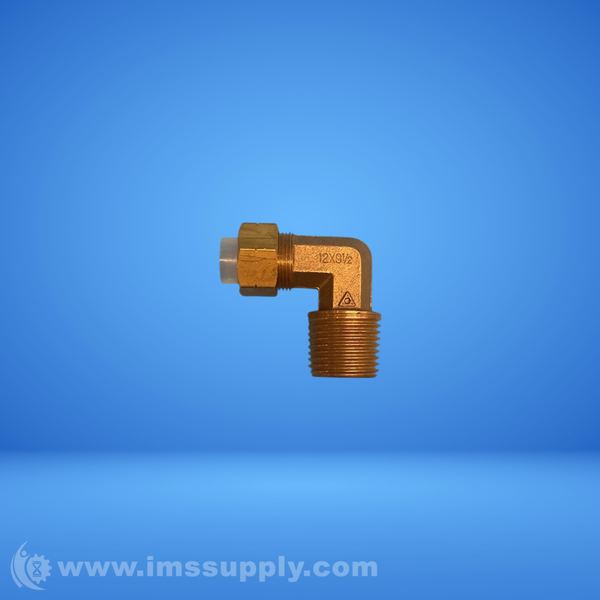 A brass 90-degree elbow pipe fitting with threaded connections, featuring a compression or flare nut on one end and male pipe threads on the other.