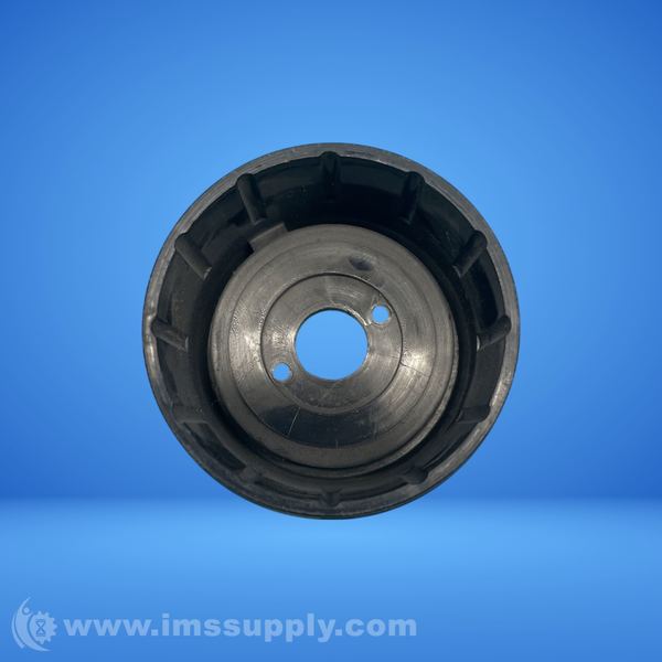 Mechanical pulley wheel with central hole and multiple smaller holes for mounting or attachment.