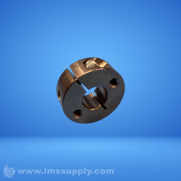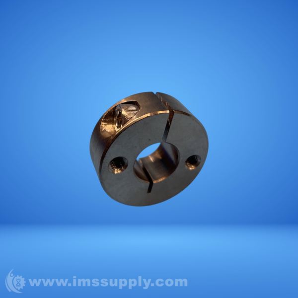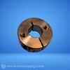 A mechanical set collar or clamp, likely used for securing shafts or other rotating components, with a split design and threaded holes for tightening.
