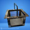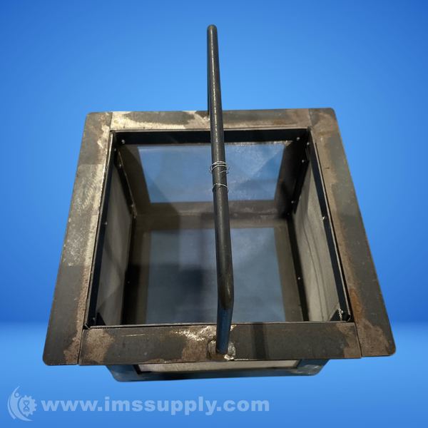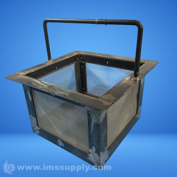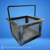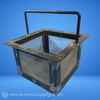 A metal charcoal basket with a handle, featuring a square shape and mesh sides for airflow.