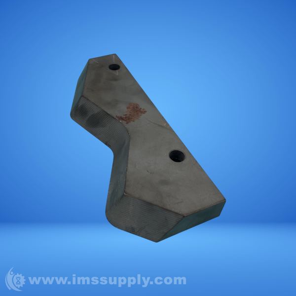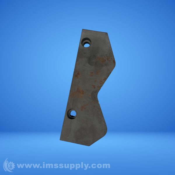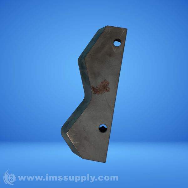A metal industrial blade or cutting tool with two mounting holes and a curved cutting edge, likely used for agricultural or construction equipment.