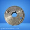 A metal timing gear or sprocket with teeth around the circumference and mounting holes.