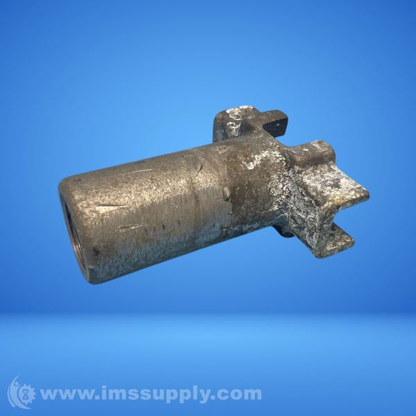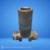 A threaded industrial pipe fitting with a cross-shaped base and cylindrical pipe attachment.