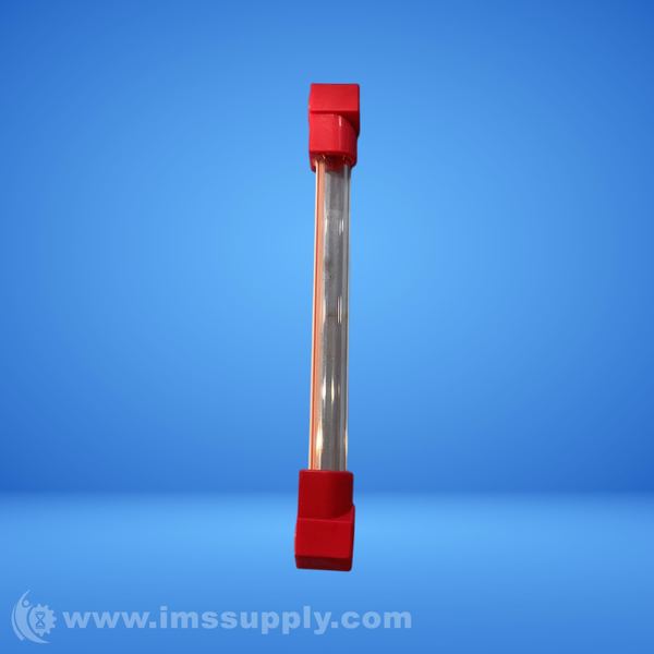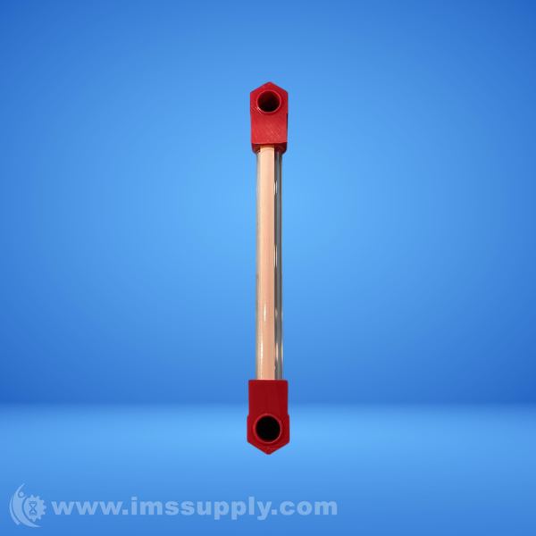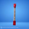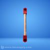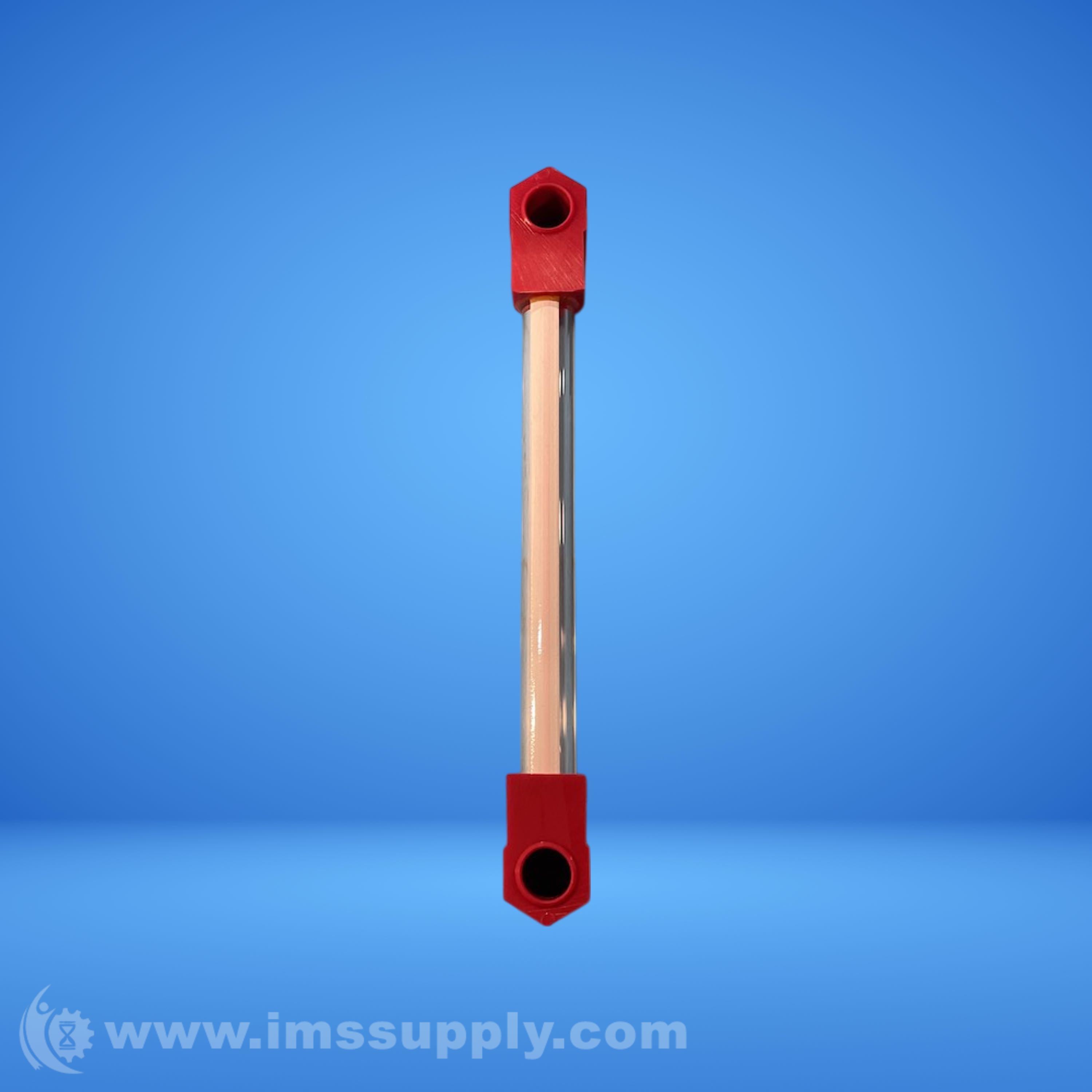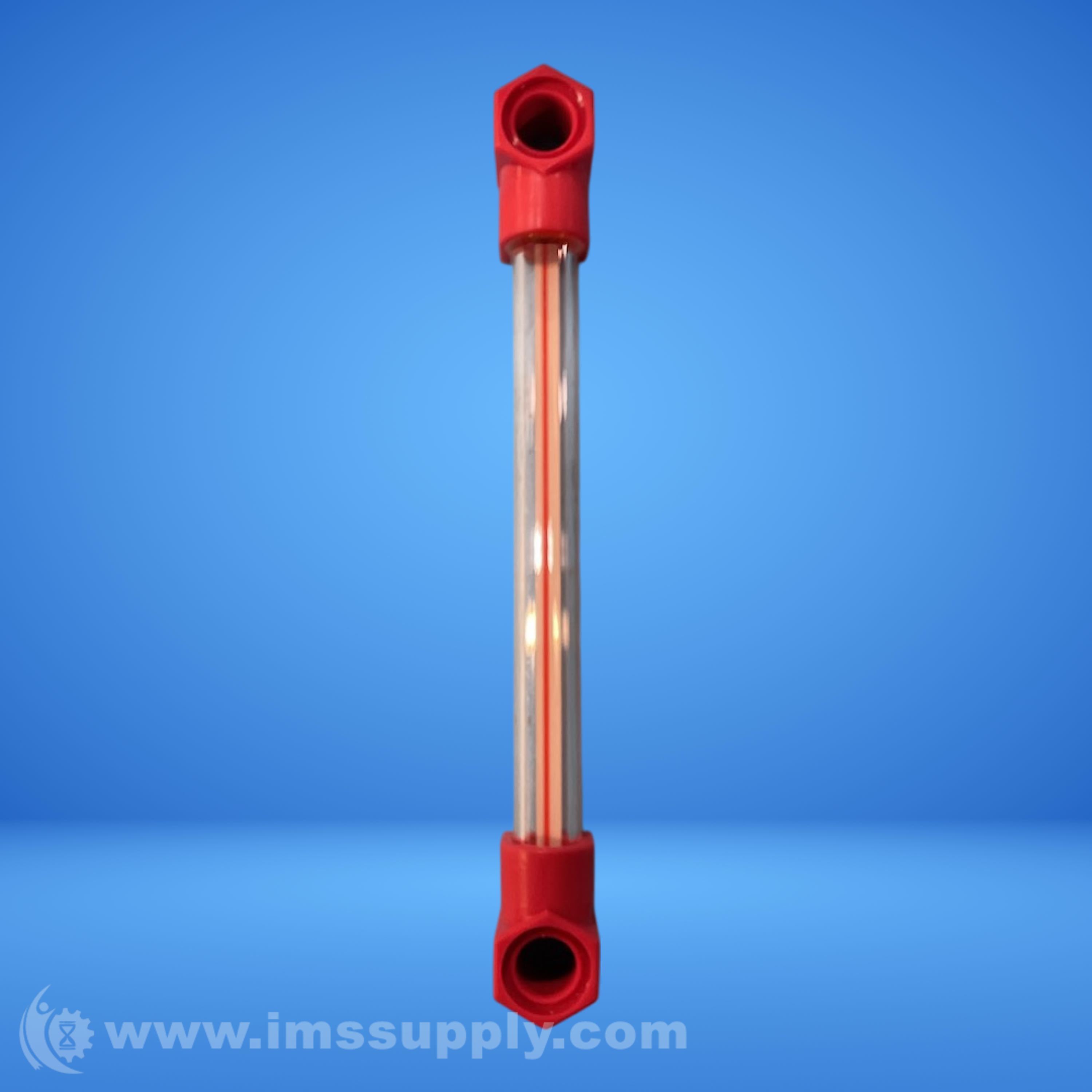 Transparent tube flow indicator with red end caps for monitoring fluid flow in industrial systems.