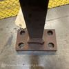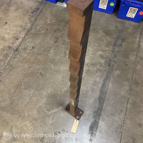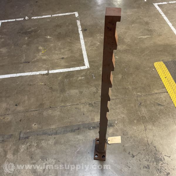 A steel rack post or column featuring a notched design for shelving or racking applications, with a base plate for mounting.