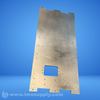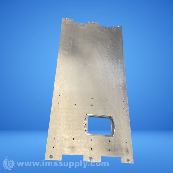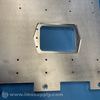 Machined metal plate with multiple holes and central rectangular cutout.