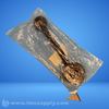 Bronze serving spoon with ornate design, packaged in plastic bag with barcode label