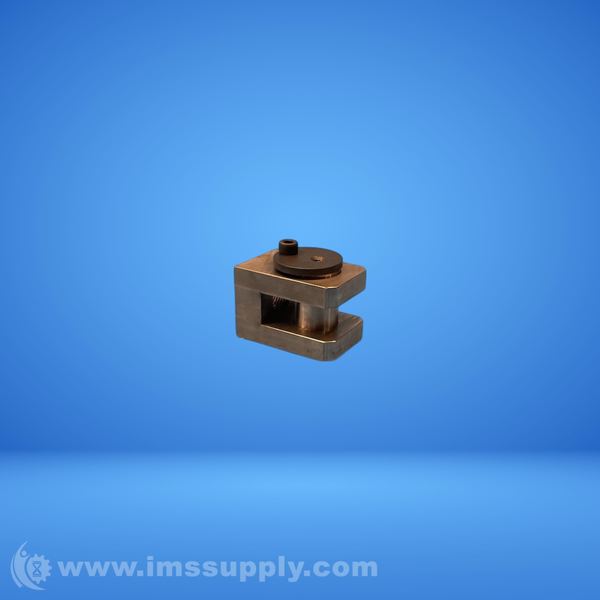 A C-clamp with a screw mechanism and a round component on top, used for clamping or holding objects in place.