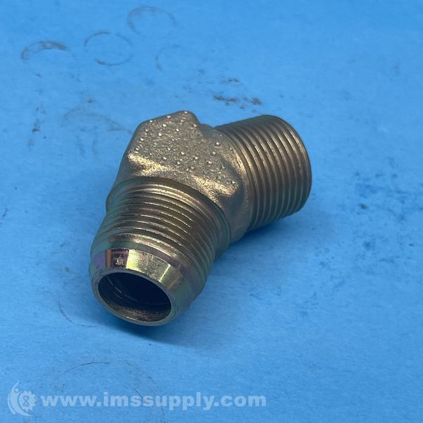 Brass street elbow fitting with threaded connections, used for changing direction of piping or tubing in industrial applications.