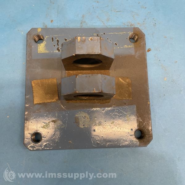 A metal mounting plate with threaded holes and a machined surface, likely used for securing industrial equipment or components.