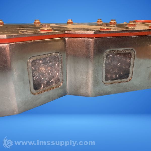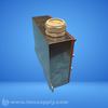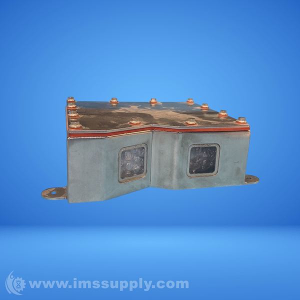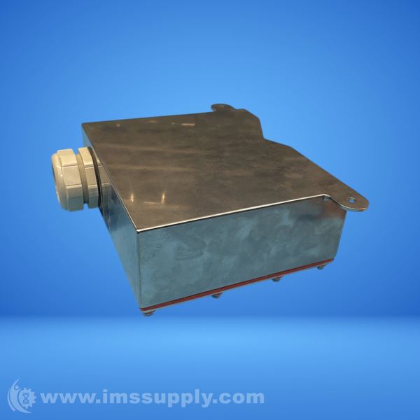 A metal enclosure with a removable top cover and mounting brackets, featuring multiple bolted connections and a plastic or ceramic connector on the side.
