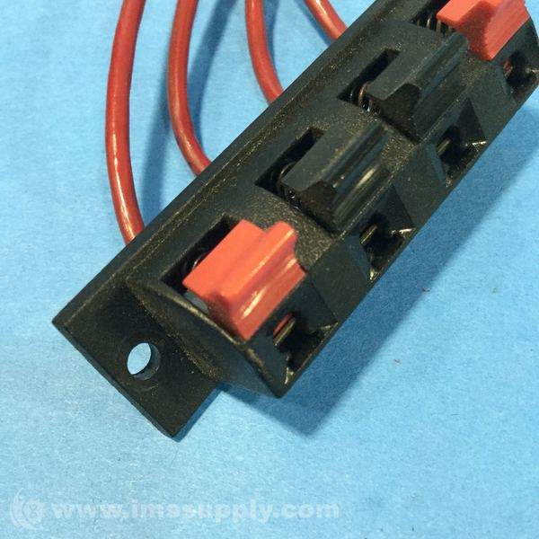 A 3-way switch module with red toggle switches and black plastic housing, connected to red wires