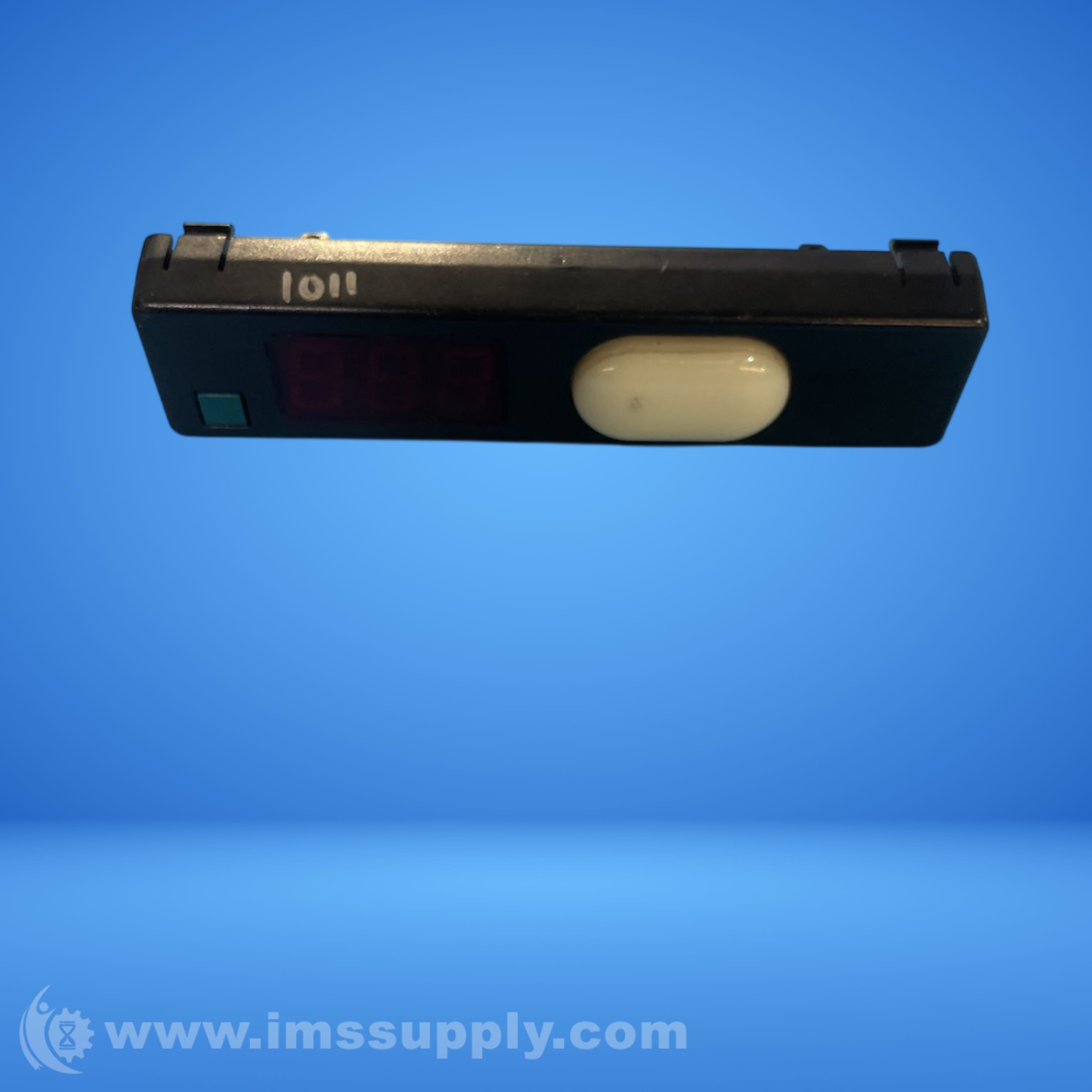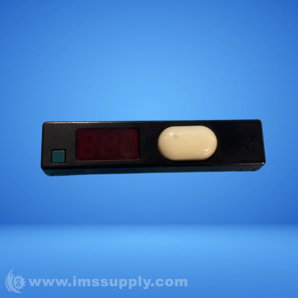 Industrial control module with digital input and output functionality, featuring a numeric display and control button