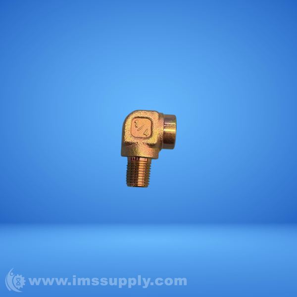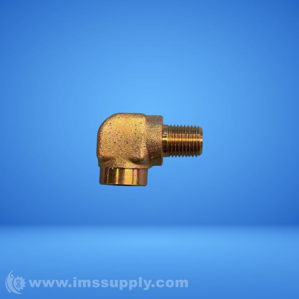 A 90-degree brass pipe elbow connector with male NPT threads on both ends, sized for 1/4 inch nominal pipe diameter.
