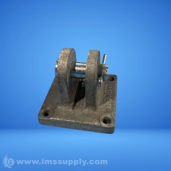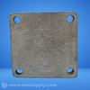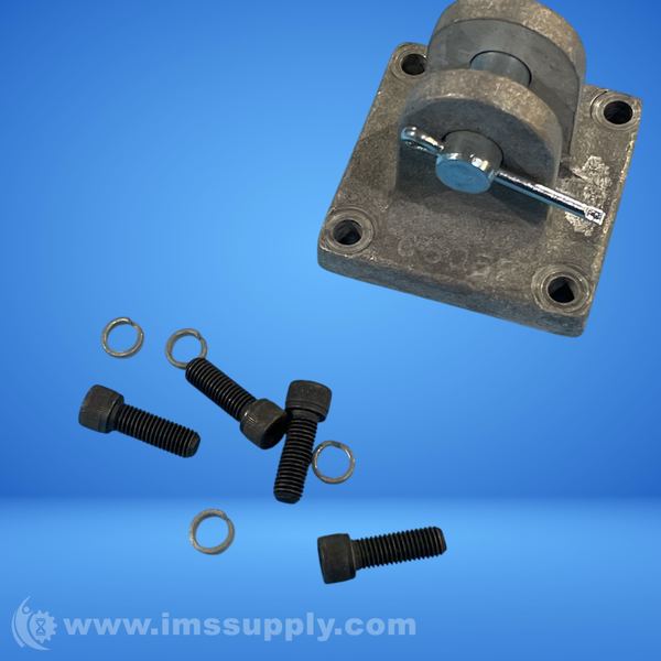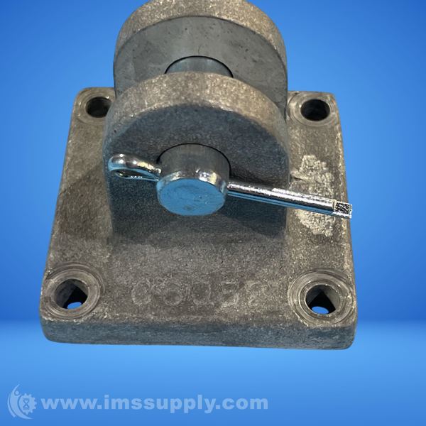 A mechanical pulley assembly with a square base and mounting holes, featuring a central axle and attached components for industrial use.