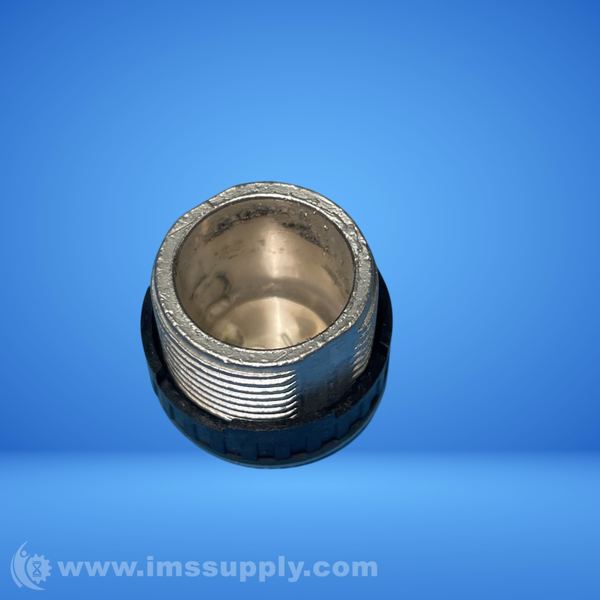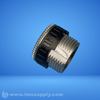 A threaded conduit plug with a black and silver finish, featuring internal threading and a serrated outer edge.