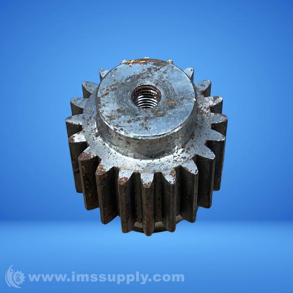 A spur gear with a threaded central hole and straight-cut teeth
