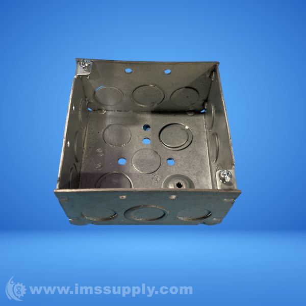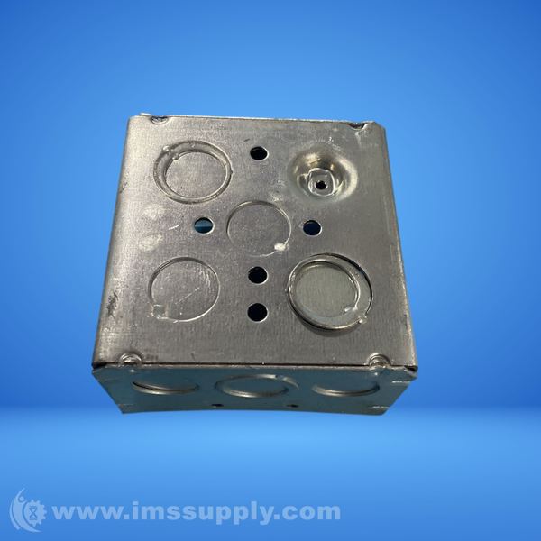 A square metal electrical box with multiple knockout holes for cable entry