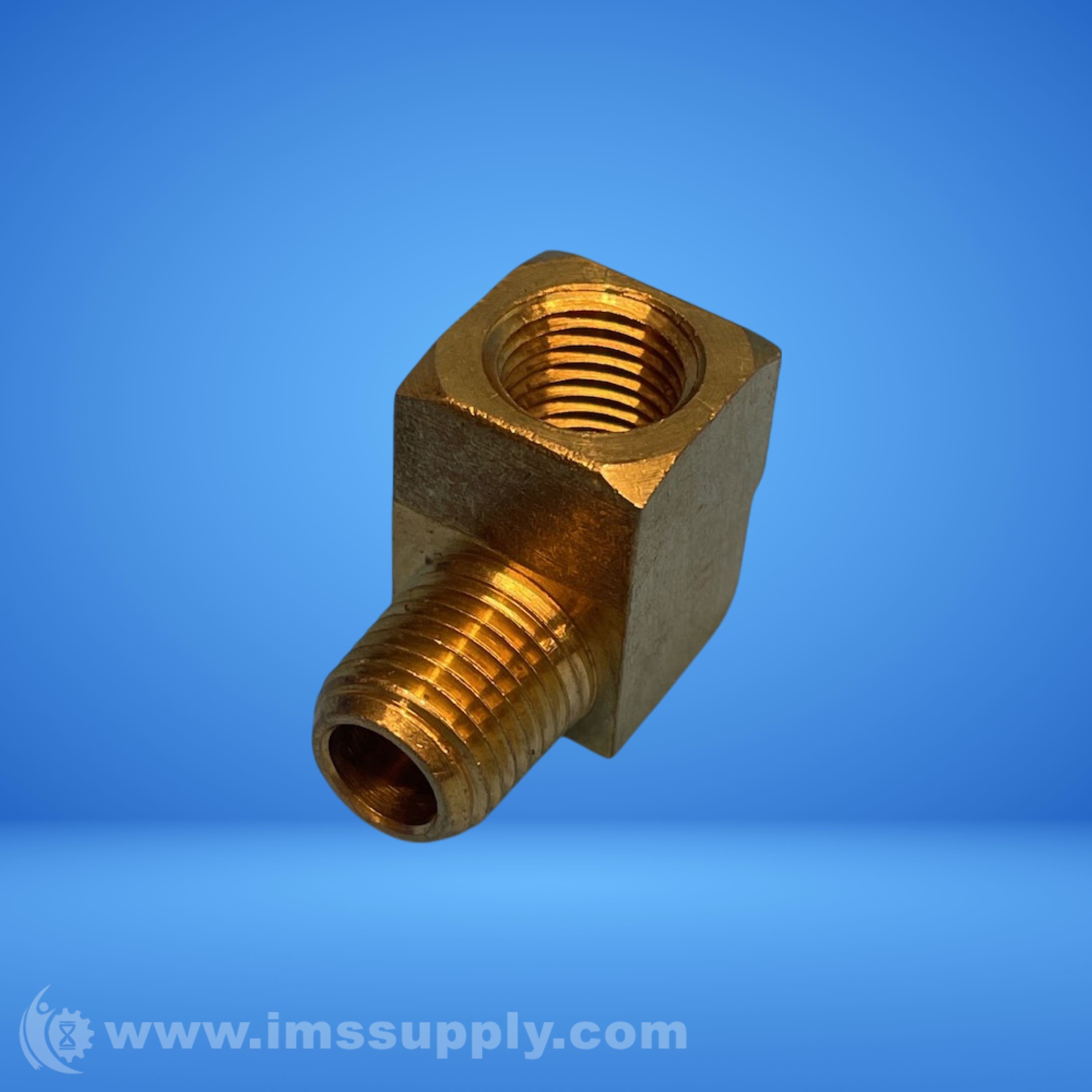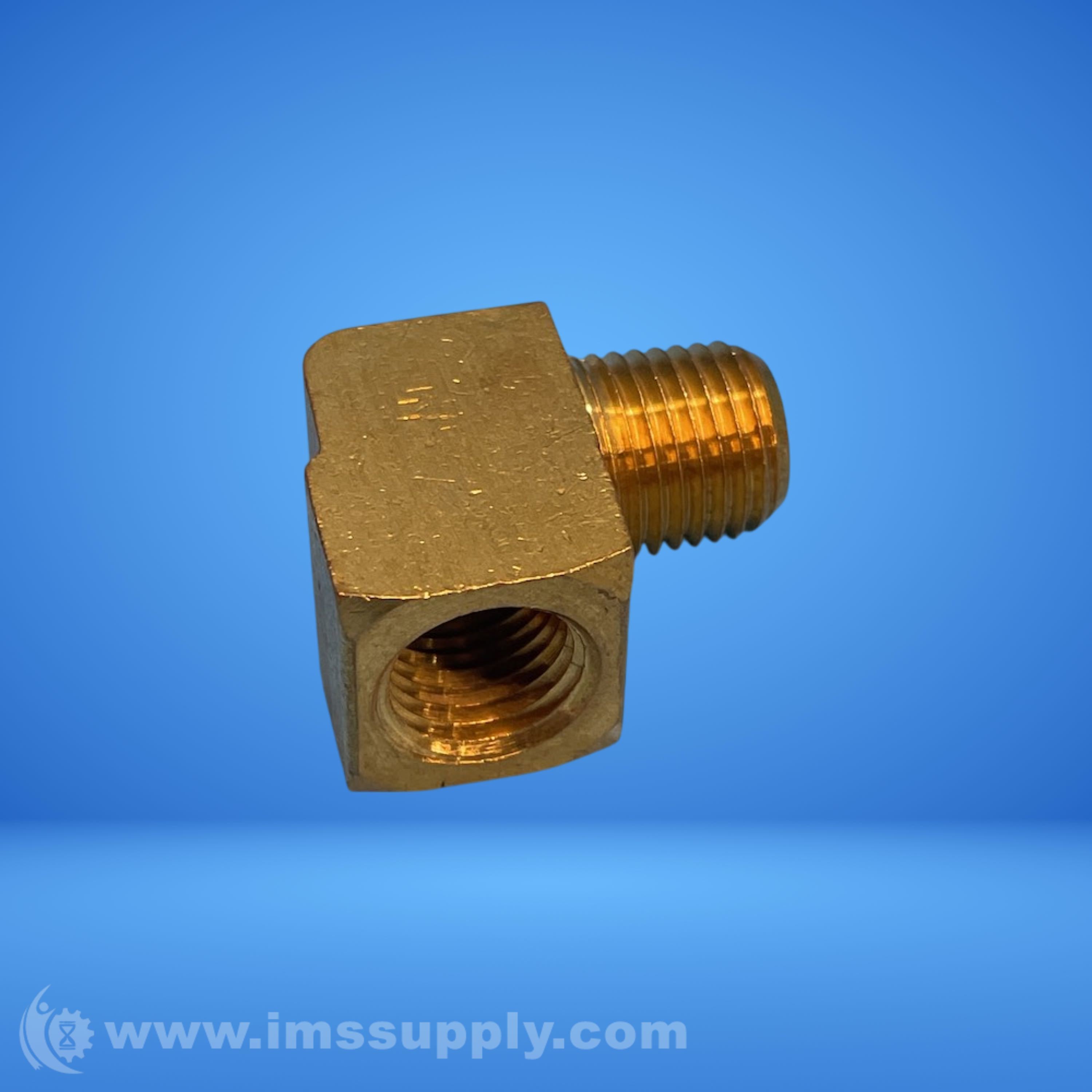 Brass pipe fitting with threaded connections, configured for 90-degree directional change in piping systems.