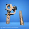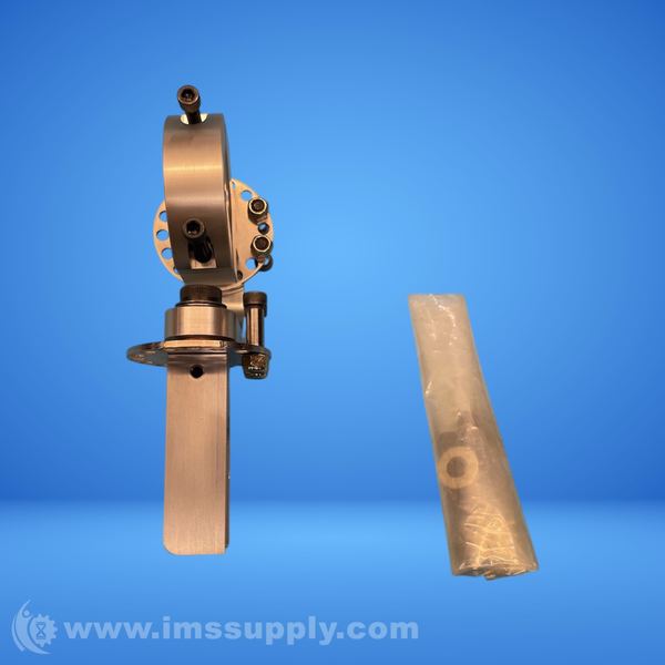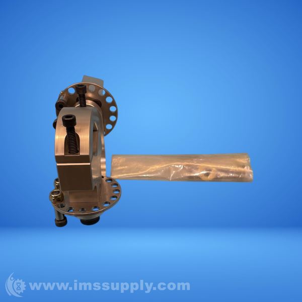 A mechanical clamp assembly with adjustable components and a protective plastic sleeve or bag covering a cylindrical part.
